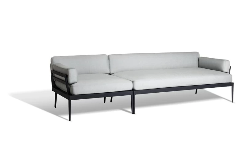 Das Anholt-Sofa ist Teil der modularen Outdoor-Möbelkollektion von Skargaarden, die sich durch einen schlichten, zurückhaltenden Look und wartungsfreie Materialien auszeichnet. Das Anholt-Sofa ist aus robustem Aluminium gefertigt und mit einem Sunbrella-Stoff gepolstert, der speziell für den Einsatz im Freien entwickelt wurde. Die gedämpfte Farbkombination aus dunkelgrauem Metall und hellgrauem Stoff verleiht der schlichten und sparsamen Form des Sofas einen Hauch von Weichheit.