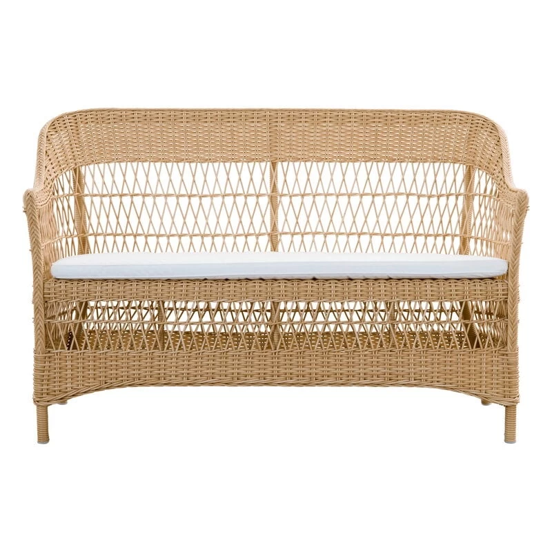 Das Charlot-Sofa von Sika-Design ist ein 2-Sitzer-Sofa für den Außenbereich mit einer hohen Rückenlehne und einem einfachen, luftigen Geflecht aus synthetischem Rattan. Die Sitzkissen sind für den Einsatz im Freien gedacht und haben abnehmbare, maschinenwaschbare Bezüge.