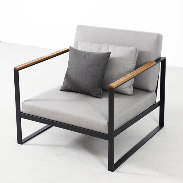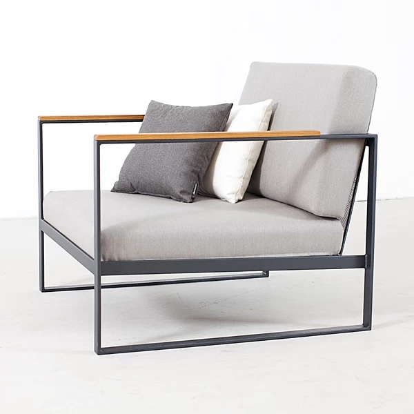 Der Loungesessel Garden Easy von Röshults ist für modernes Lounging im Freien konzipiert. Der Loungesessel ist mit Sunbrella-Stoff beschichtet, um Feuchtigkeit und Regen fernzuhalten.