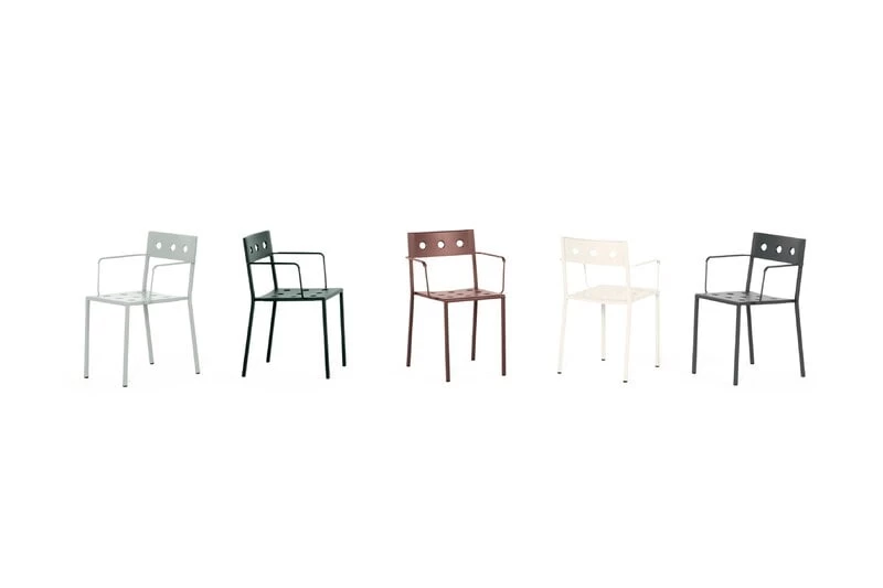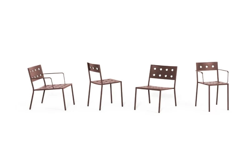 Die runden Löcher im Stahlblech erfüllen mehrere Zwecke: Zum einen verleihen sie dem geometrischen Design eine individuelle und weiche Note, zum anderen lassen sie Regenwasser an der Oberfläche leichter ablaufen und verstärken die Möbelstruktur. Eine wetterbeständige Beschichtung macht die Balcony-Kollektion zudem besonders pflegeleicht.