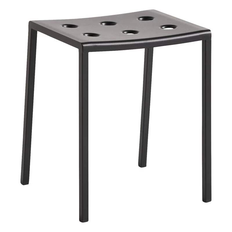 Die runden Löcher im Stahlblech erfüllen mehrere Zwecke: Zum einen verleihen sie dem geometrischen Design eine individuelle und weiche Note, zum anderen lassen sie Regenwasser an der Oberfläche leichter ablaufen und verstärken die Möbelstruktur.