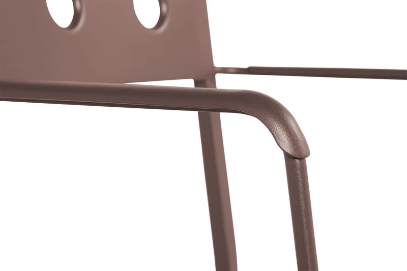 Die runden Löcher im Stahlblech erfüllen mehrere Zwecke: Zum einen verleihen sie dem geometrischen Design eine individuelle und weiche Note, zum anderen lassen sie Regenwasser an der Oberfläche leichter ablaufen und verstärken die Möbelstruktur.