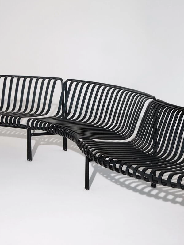 Die Palissade-Park-Sitzbank-Erweiterung ist Teil der Palissade-Park-Kollektion von HAY, die aus modularen Bänken speziell für größere Außenbereiche und den Objektbereich besteht. Die Anordnung von zwei oder mehr Bänken ergibt ganz individuelle Sitzflächen in geschwungenen, wellenförmigen und runden Konstellationen. Die Basismodule sind entweder nach innen oder nach außen geschwungen.