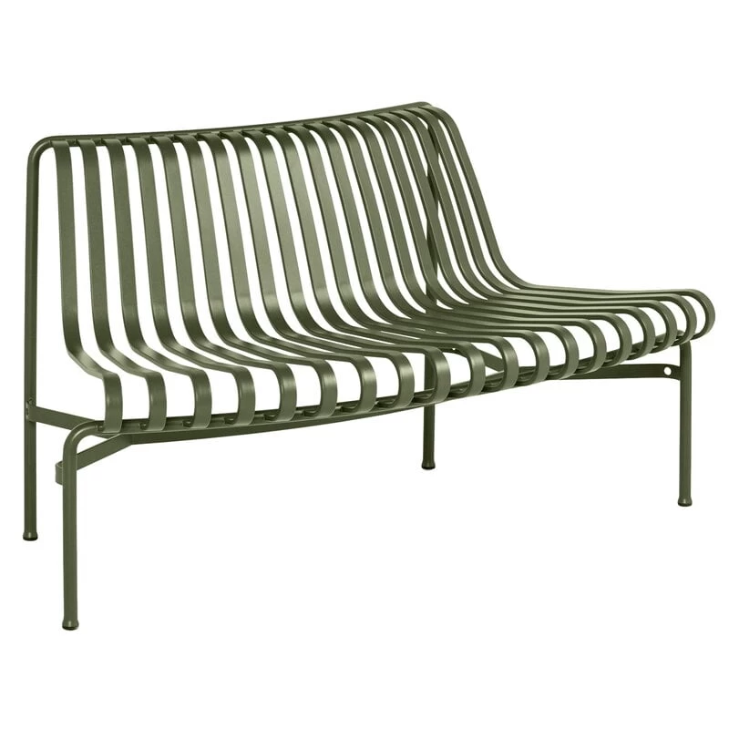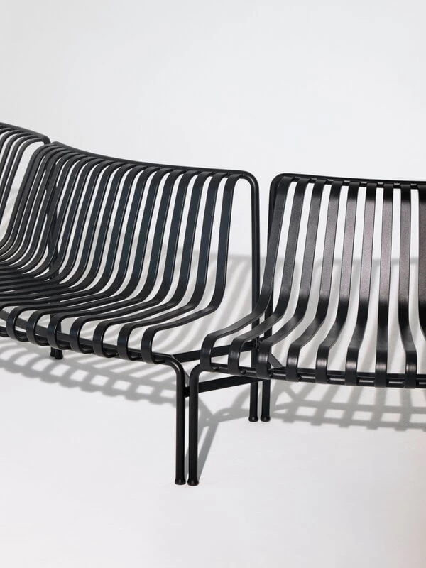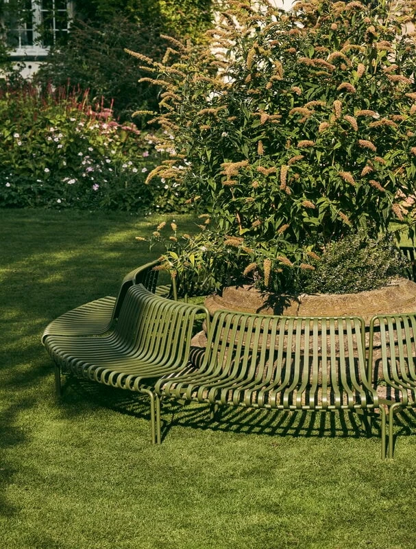 Die Palissade-Park-Sitzbank-Erweiterung ist Teil der Palissade-Park-Kollektion von HAY, die aus modularen Bänken speziell für größere Außenbereiche und den Objektbereich besteht. Die Anordnung von zwei oder mehr Bänken ergibt ganz individuelle Sitzflächen in geschwungenen, wellenförmigen und runden Konstellationen. Die Basismodule sind entweder nach innen oder nach außen geschwungen.