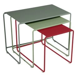 Oulala ist der verspielte Satztisch von Fermob. Wenn Sie das beeindruckende Design erblicken, wird Ihnen sicherlich ein „Oh, là, là“ entweichen. Der Oulala-Satztisch besteht aus drei eleganten Beistelltischen aus Metall, die perfekt zusammenpassen und platzsparend ineinander geschoben werden können. Die erfrischenden Farbkombinationen runden die luftig-leichte Optik der Oulala-Tische wunderbar ab, während ihr schlichtes und doch auffälliges Design sich problemlos in verschiedene Interieurs einfügt. Zaubern Sie eine verspielte Tischanordnung neben Ihrem Sofa oder platzieren Sie die Tische gezielt im Garten oder auf der Terrasse. Die vielseitigen Oulala-Tische wirken wirklich Wunder, egal, ob solo oder zusammen, ob drinnen oder draußen.