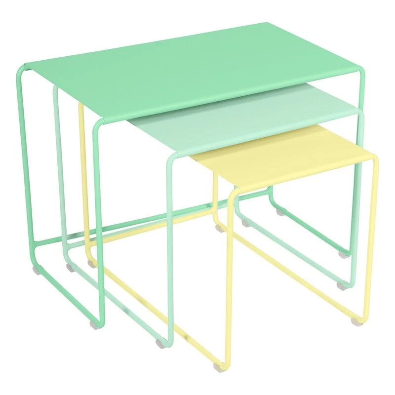 Oulala ist der verspielte Satztisch von Fermob. Wenn Sie das beeindruckende Design erblicken, wird Ihnen sicherlich ein „Oh, là, là“ entweichen. Der Oulala-Satztisch besteht aus drei eleganten Beistelltischen aus Metall, die perfekt zusammenpassen und platzsparend ineinander geschoben werden können. Die erfrischenden Farbkombinationen runden die luftig-leichte Optik der Oulala-Tische wunderbar ab, während ihr schlichtes und doch auffälliges Design sich problemlos in verschiedene Interieurs einfügt. Zaubern Sie eine verspielte Tischanordnung neben Ihrem Sofa oder platzieren Sie die Tische gezielt im Garten oder auf der Terrasse. Die vielseitigen Oulala-Tische wirken wirklich Wunder, egal, ob solo oder zusammen, ob drinnen oder draußen.