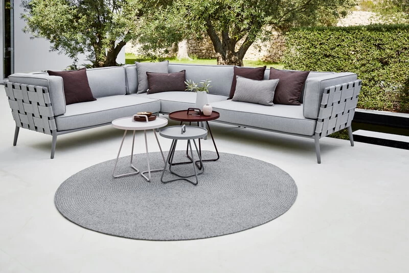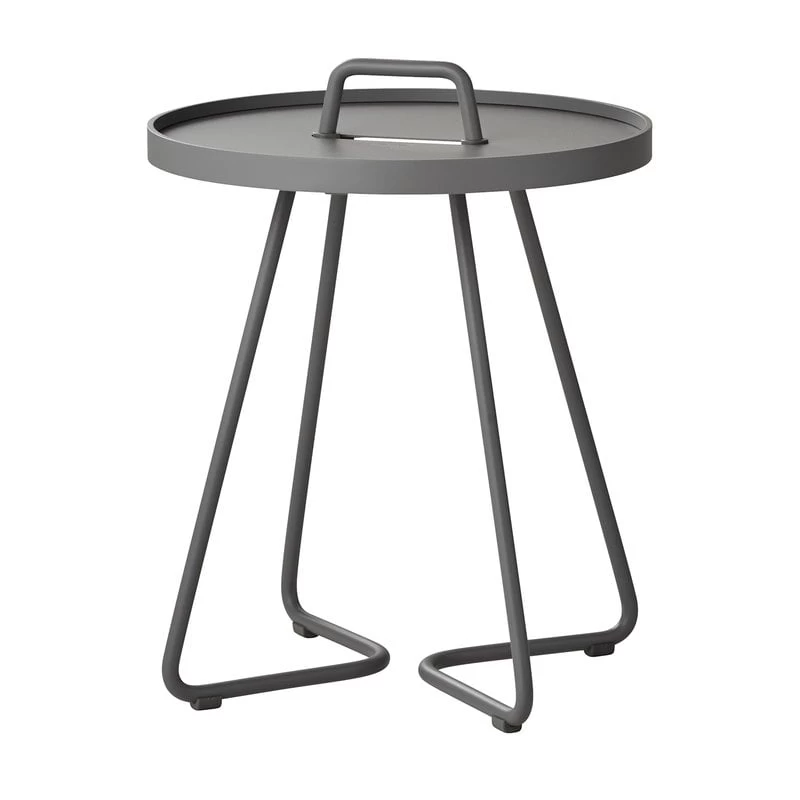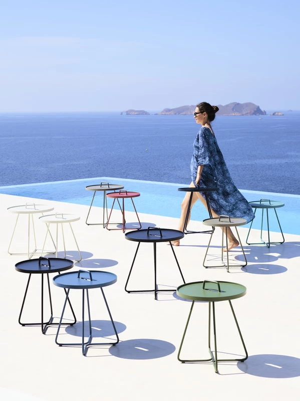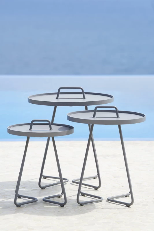 Der On-the-move von Cane-line ist ein fröhlicher und multifunktionaler Beistelltisch, der sowohl für den Innen- als auch für den Außenbereich geeignet ist. Aus robustem und leichtem Aluminium gefertigt und mit einem Griff ausgestattet lässt sich On-the-move leicht von einem Ort zum anderen bewegen. Die abnehmbare Tischplatte fungiert auch als Tablett, das abgehoben und separat verwendet werden kann. On-the-move ist ein perfekter Beistelltisch für Terrasse, Balkon oder Garten, aber auch ein praktischer, moderner Sofatisch im Wohnzimmer. Der Tisch wurde von dem dänischen Designbüro Stand+Hvass entworfen.