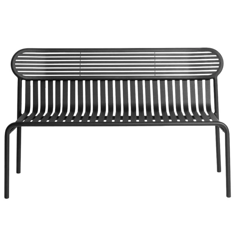 Die Bank Week-end ist Teil der Petite-Friture-Kollektion, die Aluminiummöbel für den Außengebrauch umfasst. Die Bank Week-end zeichnet sich durch ovale Formen mit sowohl horizontalen als auch vertikalen Lamellen an der Rückenlehne aus. Die Bank passt ideal zu den Tischen der Week-end-Kollektion.