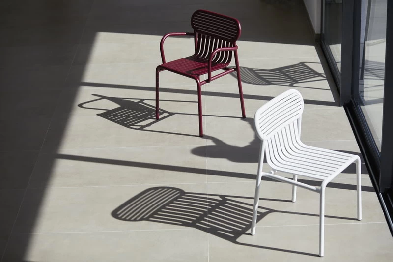 Die vom Design-Duo BrichetZiegler entworfenen Petite-Friture-Gartenmöbel Week-end kombinieren verschiedene geometrische Formen mit funktionalem, zeitgenössischem Design. Die Aluminiumstruktur macht die Stücke leicht und strapazierfähig zugleich und die epoxidharzbeschichtete, matte Oberfläche hält jeder Witterung problemlos stand. Die Serie Week-end besteht aus Stühlen, Bänken und Tischen in vielen Farben und Größen. Sie eignet sich für große Gärten ebenso wie für kleine Balkone. Dank des schlichten Designs können die Stücke auch im Innenbereich eingesetzt werden.