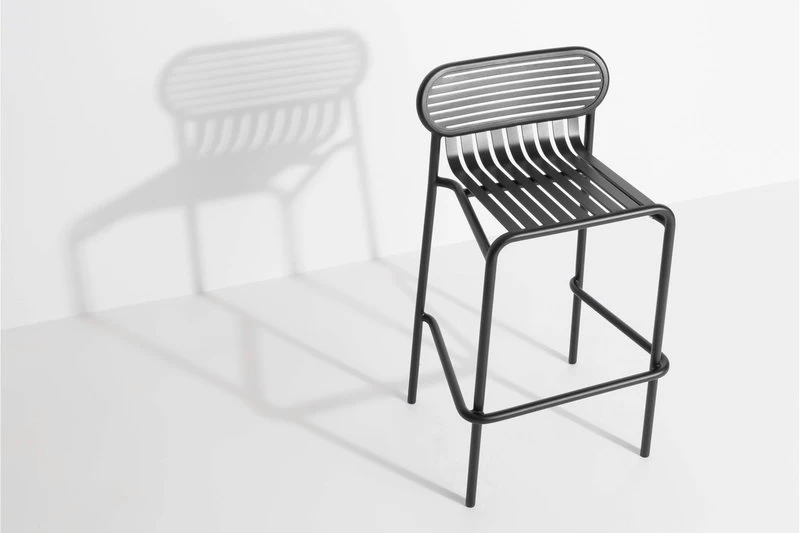 Der hohe Hocker Week-end ist Teil der Petite-Friture-Kollektion, die Aluminiummöbel für den Außengebrauch umfasst. Der hohe Hocker Week-end zeichnet sich durch ovale Formen mit sowohl horizontalen als auch vertikalen Lamellen an der Rückenlehne aus. Der Barhocker passt ideal zum hohen Tisch der Week-end-Serie.